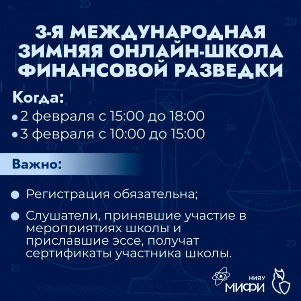 ИФТЭБ НИЯУ МИФИ совместно с Федеральной службой по финансовому мониторингу проводит 3-ю Международную зимнюю онлайн-школу финансовой разведки, где школьники, студенты и действующие специалисты смогут расширить свои знания в области ПОД/ФТ, понять, какие умения и навыки необходимы для работы в сфере финансовой безопасности в целом.